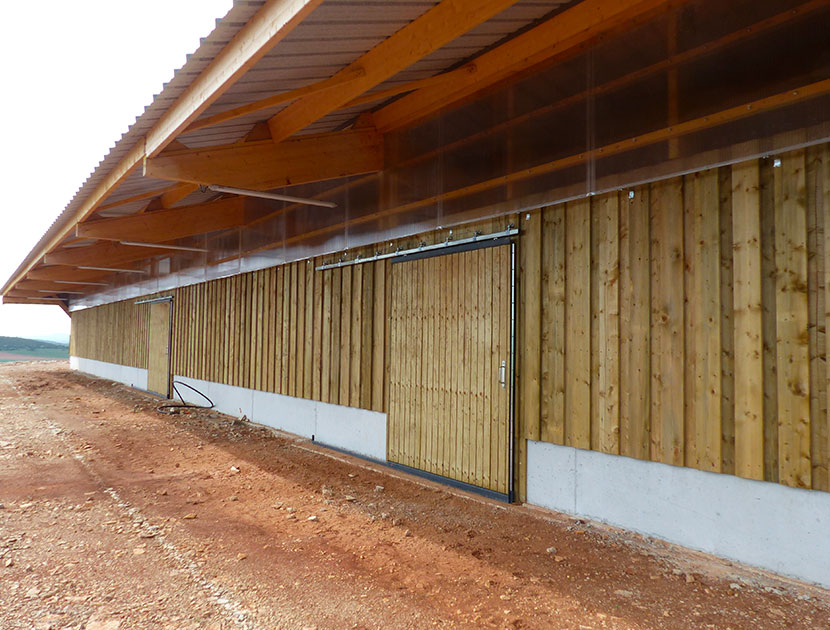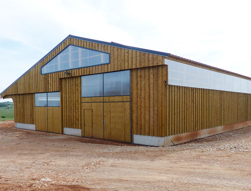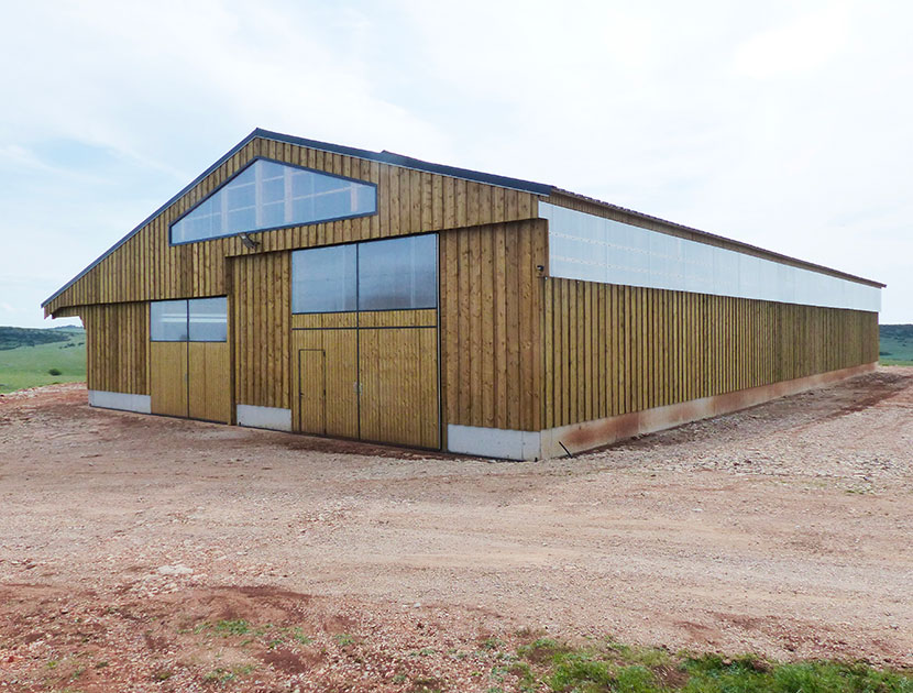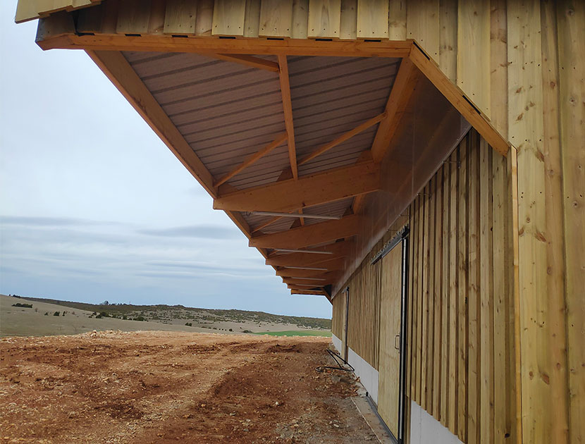 Attenante à leur ferme au toit de lauzes, la bergerie ne contient que 55 places. Aussi, pour accueillir jusqu’à 80 brebis et 20 bovins, les deux leveuses ont décidé la construction d’un bâtiment neuf, en bois, de 756m2 au sol. La pente sud du toit, prolongée par un auvent pour le nourrissage en extérieur, s’étend sur 414m2. Cet aspect n’a pas échappé à Lum del Larzac qui a proposé à Marylin et Adeline d’y